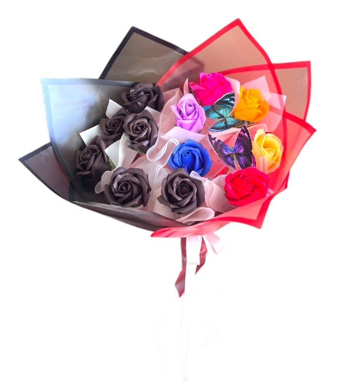 Siyah, beyaz, pembe, mavi, sarı ve kırmızı yapay güllerle hazırlanmış özel konsept buket. İki yapay kelebek figürüyle tamamlanmış, kırmızı kenarlı şeffaf ambalaj ve pembe-beyaz kurdele ile sunulmuştur. Renk geçişleriyle “senden önce”nin solgunluğunu ve “senden sonra”nın canlılığını simgeler. Karaman içi teslimatla sevdiklerinize ulaştırılır.