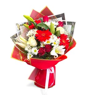 Kırmızı gerbera, beyaz lilyum, beyaz ve kırmızı güller, beyaz krizantem ve yeşil yapraklarla hazırlanmış gösterişli buket. Kırmızı ve altın renkli ambalajla sarılmış, beyaz kurdele ile tamamlanmıştır. Özel günlerde sevdiklerinize anlamlı bir jest sunar. Karaman içi teslimatla sunulur.