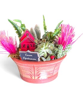 Kırmızı seramik saksı içinde farklı türde yapay sukulentler, minyatür kırmızı ev figürü, pembe-yeşil dekoratif çim süsleri, uğur böceği figürü ve “Canım Öğretmenim” yazılı tabela ile hazırlanmış özel aranjman. Öğretmenler Günü için sevimli, renkli ve anlamlı bir hediye seçeneğidir. Karaman içi teslimatla sevdiklerinize ulaştırılır.