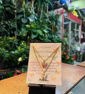 Aşkın verdiği o tatlı heyecanı boynunda taşısın... "Kalbime her bakışında kelebekler konduran..." mesajlı özel kartıyla sunulan bu zarif tasarım, son dönemin trendi olan çift zincir görünümüne sahip. Pembe ve beyazın masum uyumunu yansıtan iki farklı kelebek figürüyle hareketlendirilen bu kolye, sevgilinizin kalbini pır pır ettirecek. Çiçek siparişinizin yanına ekleyerek duygularınızı ölümsüzleştirebileceğiniz bu özel hediyeyi, Karaman Çiçek güvencesi ve hızlı teslimat ile hemen sepetinize ekleyin.Takı ve hediyelik eşya kategorimiz alınan ürünün yanına ek ürün olarak stoklarımıza konulmuştur. Sadece takı ya da hediyelik eşya almak isterseniz satış fiyatının üzerine kargo ücreti eklenmektedir. Siz değerli müşterilerimiz için tavsiyemiz sayfamızdan beğendiğiniz ürünün sipraişini oluştururken ek ürün olarak satın almanız. Keyifli alışverişler dileriz.