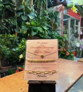 Aşkın en zarif sembolü bileklerde... "Asıl hediye, senin varlığın" mesajlı özel kartıyla sunulan bu kombin; minik kalp figürlü ince zincir, klasik burgu zincir ve modern ataç model zincirden oluşan üçlü bir set sunuyor. Hem romantik hem de trend bir görünüm arayanlar için tasarlanan bu şık aksesuar, Sevgililer Günü'nde çiçeğinizin yanına eklenebilecek en anlamlı hediye. Karaman Çiçek kalitesi ve hızlı teslimat avantajıyla, bu özel seti hemen sepetinize ekleyin.Takı ve hediyelik eşya kategorimiz alınan ürünün yanına ek ürün olarak stoklarımıza konulmuştur. Sadece takı ya da hediyelik eşya almak isterseniz satış fiyatının üzerine kargo ücreti eklenmektedir. Siz değerli müşterilerimiz için tavsiyemiz sayfamızdan beğendiğiniz ürünün sipraişini oluştururken ek ürün olarak satın almanız. Keyifli alışverişler dileriz.