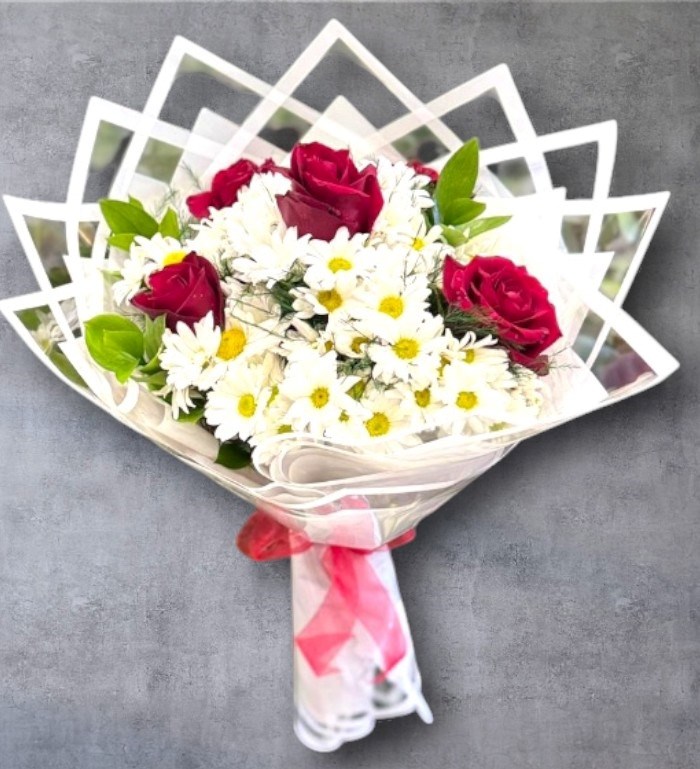 Kırmızı güllerin tutkusu ve beyaz papatyaların masumiyeti, özel tasarım beyaz geometrik ambalajla buluştu. Hem modern hem de romantik bir hediye arayanlar için günlük taze çiçekler ile özenle tasarlandı. Karaman Çiçek kalitesi ve hızlı teslimat avantajıyla, sevdiklerinize bu şıklığı hemen hediye edebilirsiniz.