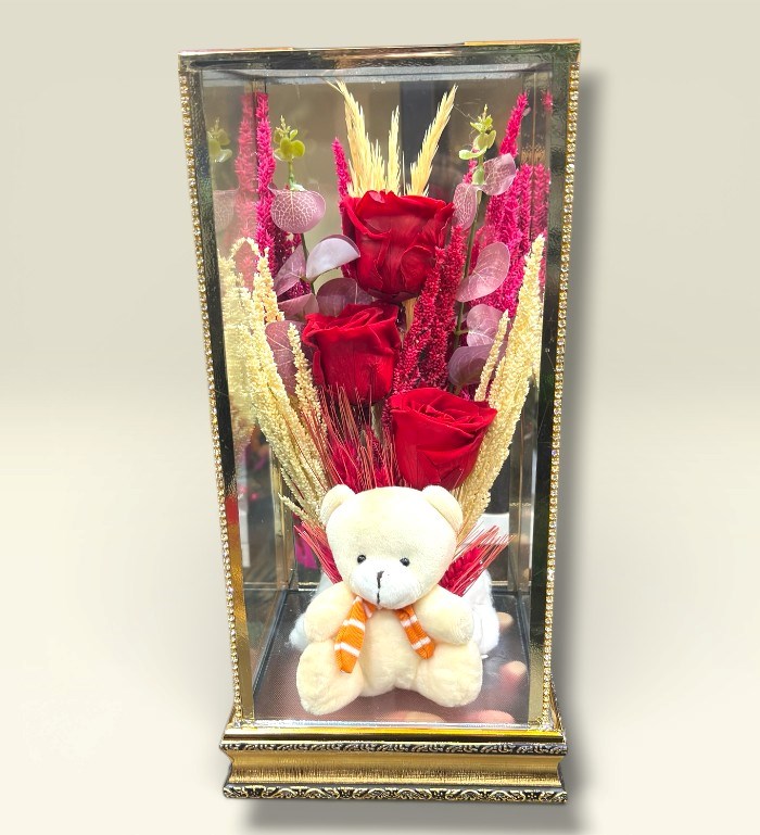 benzersiz bir şekilde tasarlanmış olan bu şık cam fanus aranjmanı, kırmızı gülün zarafeti ve nostaljik çift figürleriyle aşkın sonsuzluğunu simgeliyor, özel anlarınızı ölümsüzleştiriyor. Doğal dokular ve şık çiçeklerle zenginleştirilmiş, cam fanus içinde zarif bir düzenleme oluşturulmuş. Hem dekorasyon hem de duygusal bir hediye olarak, sevdiklerinize kalıcı ve anlamlı bir hatıra sunuyor.
