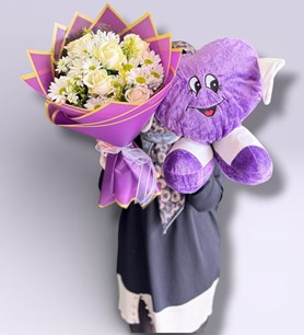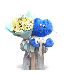 Beyaz güller ve papatyalarla hazırlanmış zarif buket, açık mavi ambalaj ve beyaz kurdele ile tamamlanmıştır. Yanında gülümseyen yüzüyle mavi peluş kalp yer alır. Doğum günü, sevgililer günü, yıldönümü veya moral hediyesi olarak hem romantik hem de neşeli bir seçenektir. Karaman içi teslimatla sunulur.