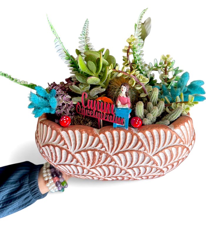 Yaprak desenli oval seramik saksı içinde farklı türde yapay sukulentler, “Cactus Queen” yazılı figür, mavi tüy süsleri, kırmızı zar figürleri ve renkli dekoratif detaylarla hazırlanmış özel aranjman. Eğlenceli ve özgün tarzıyla öğretmenler için sıra dışı bir hediye seçeneğidir. Karaman içi teslimatla sevdiklerinize ulaştırılır.