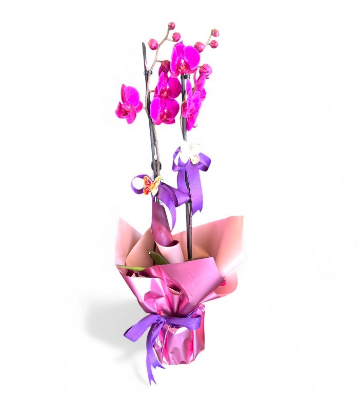 Mor çiçekli, tomurcuklu çift dallı orkide bitkisi; parlak pembe ambalaj ve mor kurdele ile süslenmiştir. Üzerinde dekoratif kelebek ve yapay çiçek detayları yer alır. Hem zarif hem de uzun ömürlü bir hediye alternatifi sunar. Karaman içi teslimatla sevdiklerinize ulaştırılır.