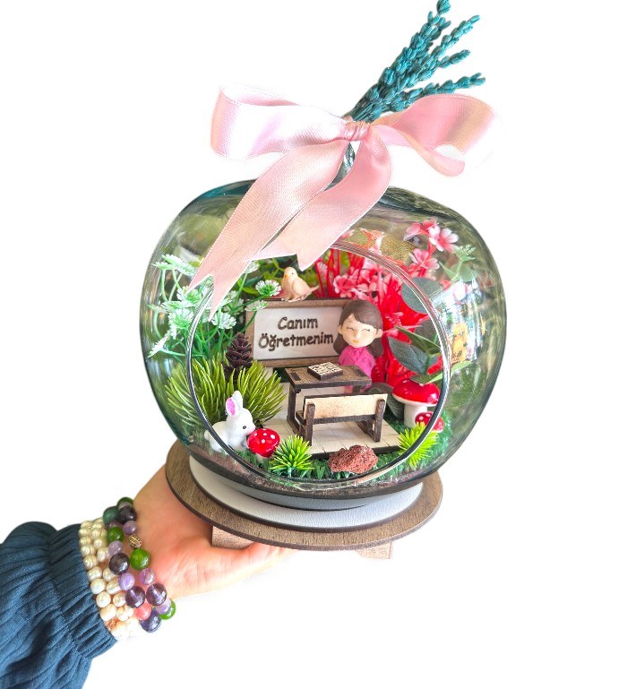 Elma formunda cam fanus içinde yapay çiçekler, minyatür figürler ve “Canım Öğretmenim” yazılı dekorla hazırlanmış özel teraryum. Üst kısmı lavanta demeti ve pembe kurdele ile süslenmiştir. Öğretmenler Günü için anlamlı ve dekoratif bir hediye seçeneğidir. Karaman içi teslimatla sevdiklerinize ulaştırılır.