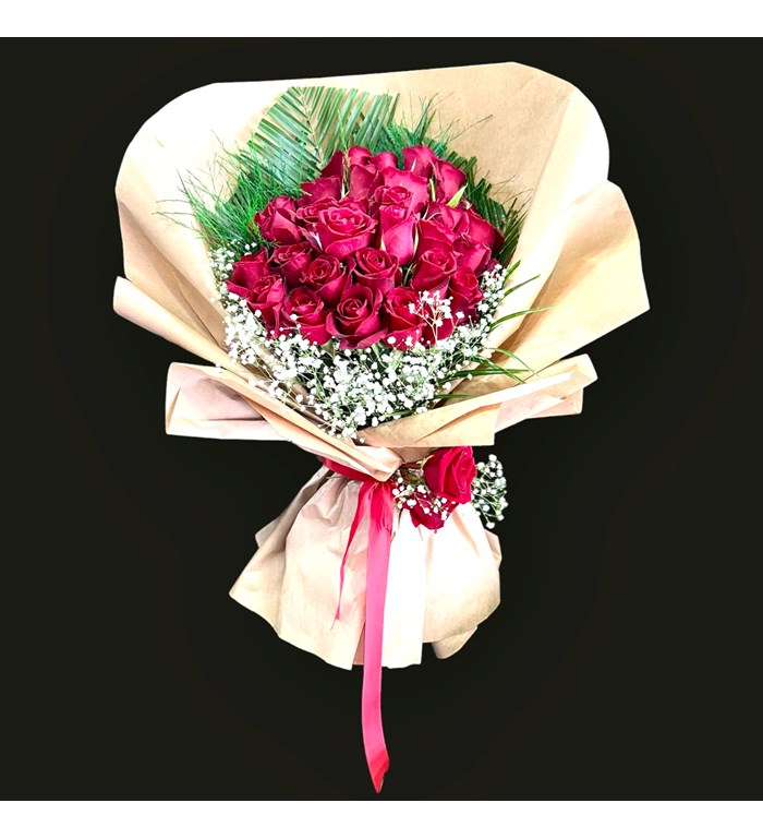 Kırmızı güller, cipso çiçekleri ve eğrelti yapraklarıyla hazırlanmış romantik buket. Katmanlı kahverengi ambalaj ve pembe kurdele ile tamamlanmıştır. Sevgililer Günü, yıldönümü, doğum günü veya özel bir teşekkür için ideal bir hediye. Karaman içi teslimatla sunulur.