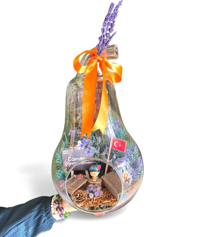 Armut formunda cam fanus içinde minyatür oturan figür, yapay çiçekler, lavanta demeti, ve “Canım Öğretmenim” yazılı tabela ile hazırlanmış özel teraryum. Üst kısmı turuncu kurdele ile süslenmiştir. Öğretmenler Günü için anlamlı ve özgün bir hediye seçeneğidir. Karaman içi teslimatla sunulur.