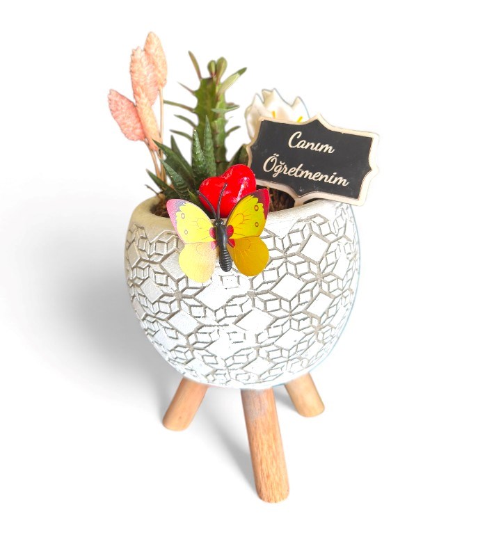 Geometrik desenli ayaklı saksı içinde yapay çiçekler, pembe-turuncu yapraklar, kırmızı çiçek ve kelebek figürüyle hazırlanmış özel aranjman. “Canım Öğretmenim” yazılı tabela ile Öğretmenler Günü’ne özel zarif bir hediye sunar. Karaman içi teslimatla sevdiklerinize ulaştırılır.