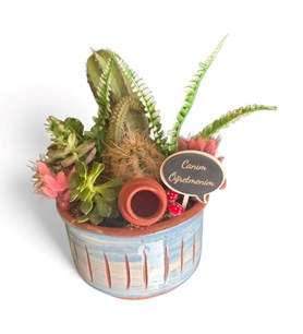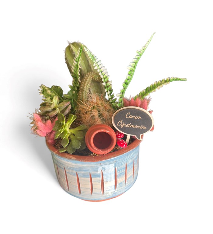 Öğretmen Temalı Sukulent & Kaktüs Aranjmanı – Testili Mavi Saksı