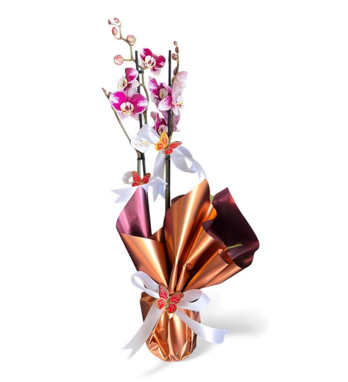 Pembe-Beyaz Orkide Harmonisi – Kelebekli ve Kurdeleli Tasarım