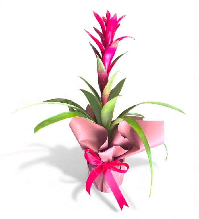 Pembe braktlı bromeliad bitkisi, dekoratif pembe ambalaj ve kurdele ile şık şekilde hazırlanmıştır. Renkli görünümüyle iç mekanlarda tropik bir hava yaratır. Doğum günü, yeni iş tebriği veya teşekkür hediyesi olarak tercih edilir. Karaman içi teslimatla sunulur.