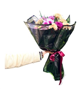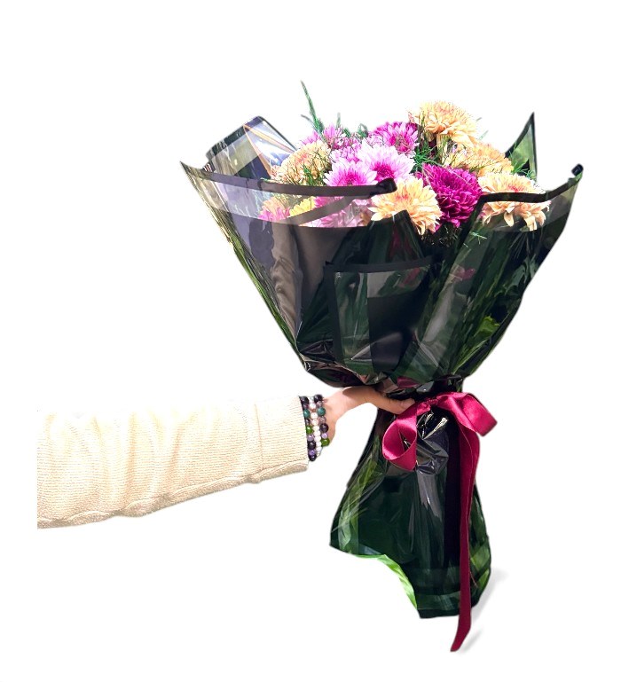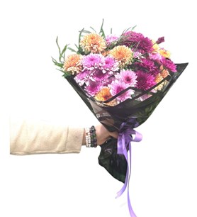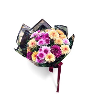 Pembe, mor, turuncu ve sarı tonlarında krizantem çiçekleri; yeşil yapraklarla birlikte siyah ambalaj içinde sunulmuştur. Mor kurdele ile bağlanarak şık bir görünüm kazandırılmıştır. Canlı renkleriyle doğum günü, teşekkür, kutlama veya moral hediyesi olarak tercih edilebilir. Karaman içi teslimatla sevdiklerinize ulaştırılır.