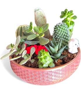 Geometrik desenli seramik saksı içinde farklı türde yapay sukulentler, kırmızı çiçek detayı ve sevimli köpek figürüyle hazırlanmış dekoratif aranjman. Ev ve ofis ortamlarına doğal bir dokunuş katar. Karaman içi teslimatla sunulur.